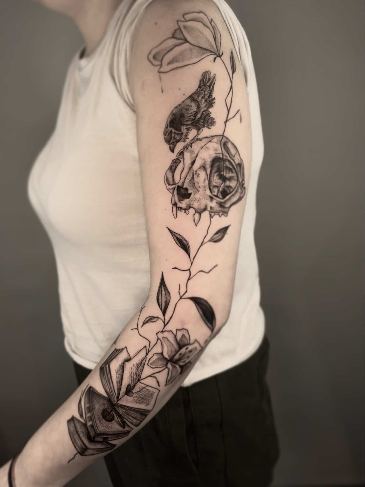 Hi! I am Kiky, I am from Italy and I have been tattooing for about 4 years. My style blends illustrative, abstract, surrealist, and fine line elements, resulting in unique designs. I have always been into art, having a degree in fine arts and studying for my MA in illustration. I am happy to work in colours and black and gray as well, small, medium and big projects!